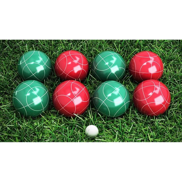 Deluxe tournament standard bocce set includes 4 x red balls and 4 x blue balls measuring 10cm in diameter each, a white pallino (jack). Complete with Oxford canvas carry bag.
