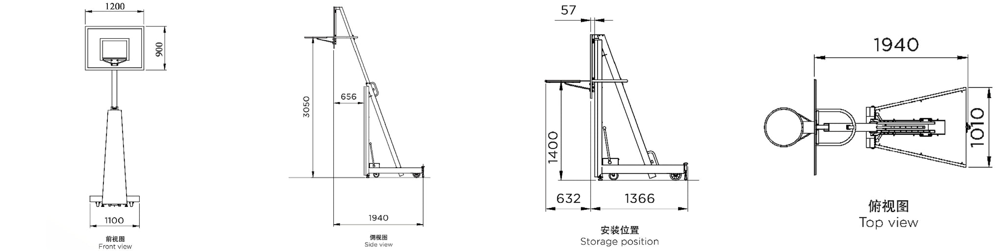• Including 2 front caster wheels and 2 floor props
